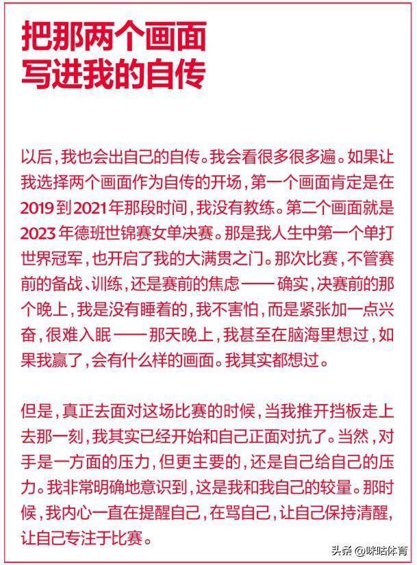 如果让我选择两个画面作为自传的开场,第一个画面是2019-2021年那段时间没有教练,第二个画面是2023年德班世锦赛女单决赛。